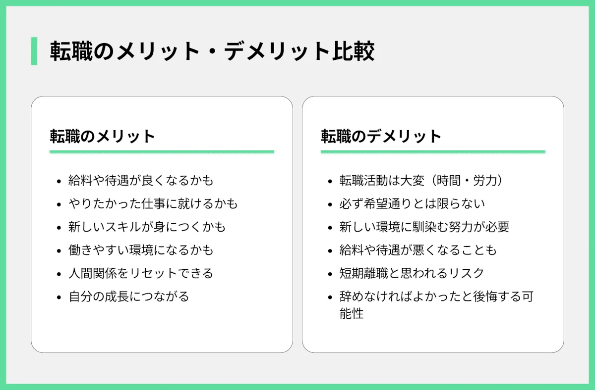 転職は、あなたのキャリアにとって大きな転機になる可能性があります。ですが、良いことばかりではありません。転職を考えるなら、メリットとデメリットの両方をしっかり理解しておくことが大切です。