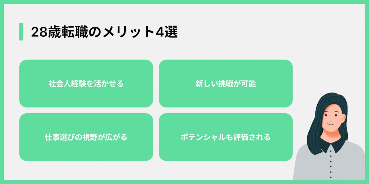 28歳での転職には、実はメリットもたくさんあります。不安な気持ちだけでなく、良い面にも目を向けてみましょう。転職活動へのモチベーションも上がるはずです。