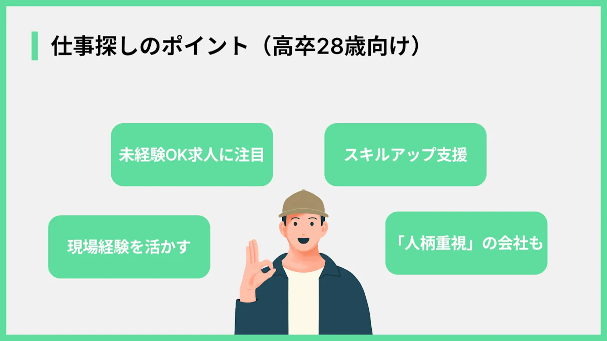 「高卒28歳だと、どんな仕事に転職できるんだろう?」と具体的な仕事について気になっている方もいるでしょう。ここでは、仕事を探す上でのポイントや、おすすめの視点を紹介します。