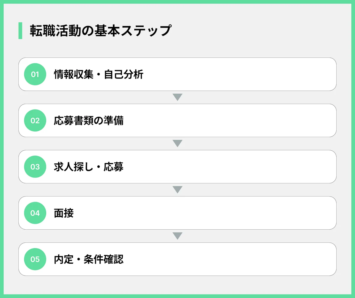 「転職活動って、何から始めたらいいの?」という方のために、基本的な流れをステップごとに解説します。全体像を把握しておくと、計画的に進めやすくなりますよ。