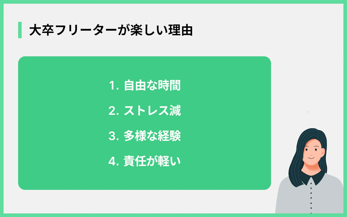 大卒でフリーターとして働くことについて、「楽しい」と感じる人がいるのはなぜでしょうか。その主な理由は以下の通りです。
