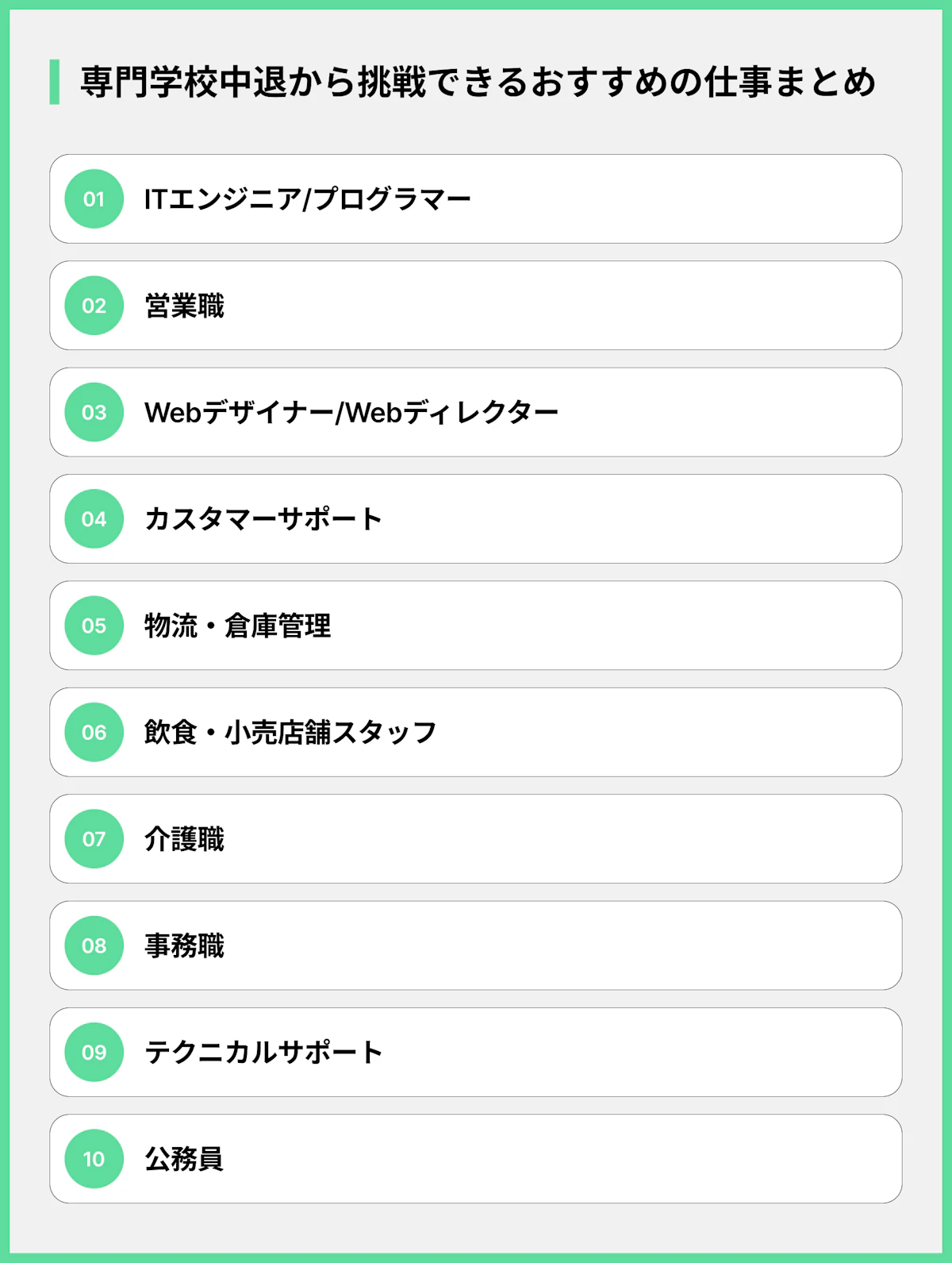 専門学校を中退した後、「フリーターになるしかないのかな…」と考えてしまう人もいるかもしれません。しかし、そんなことはありません。学歴や経験を問わず、未経験からでもチャレンジできる正社員の仕事はたくさんあります。ここでは代表的な仕事を10個ご紹介します。