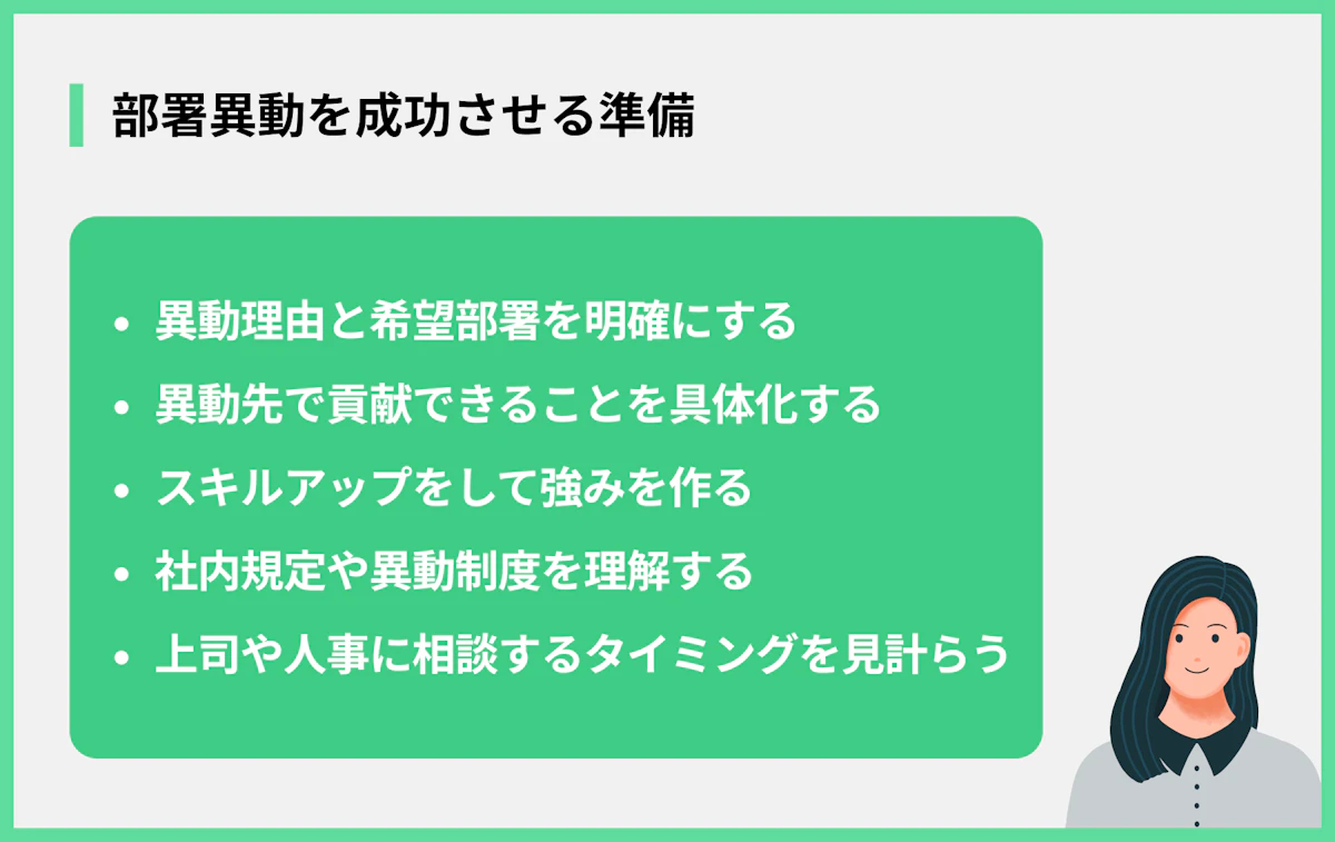 もし現在の部署での仕事がどうしても合わないと感じ、部署異動を希望するなら、そのための準備を早めに始めることが重要です。まずは、なぜ今の部署が合わないのか、そしてなぜ別の部署に行きたいのかを具体的に整理します。感情的な理由だけでなく、自身のスキルやキャリアプランとの関連性を明確にすることが大切です。また、異動を希望する部署で、自分がどのような貢献ができるのかをアピールできるよう、その部署の業務内容や求められるスキルを調べておくと良いでしょう。