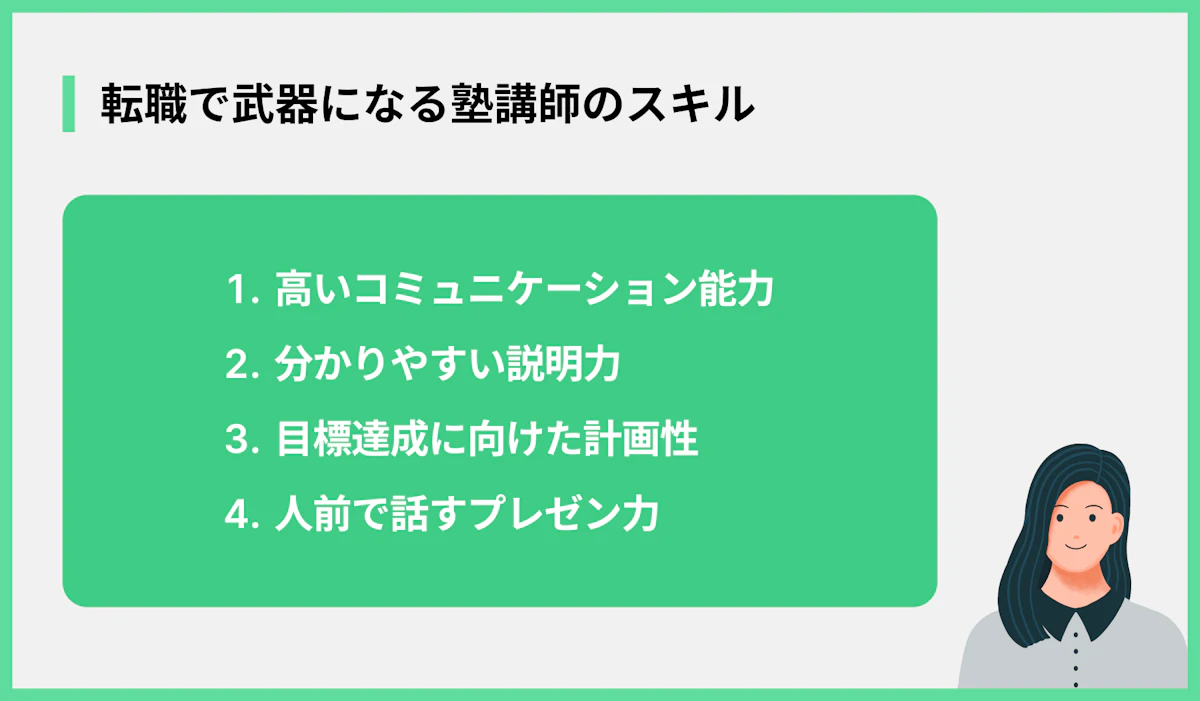 数十人の生徒の前で授業を行うことは、毎回プレゼンテーションをしているようなものです。生徒を飽きさせず、集中力を維持させるために、人前で話す力がつき、話の構成や伝え方を工夫するようになります。大勢の前でも堂々と、かつ論理的に話すスキルは、塾講師の仕事を通じて磨かれる大きな強みです。この経験は、他の職種に転職する際にも、強力なアピールポイントになります。