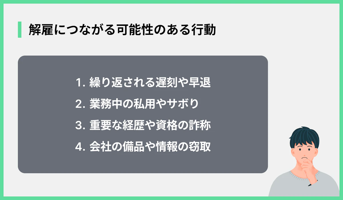 勤務態度に明らかな問題がある場合も、解雇の理由になり得ます。例えば、正当な理由なく無断欠勤を繰り返したり、何度も遅刻をしたり、仕事中に業務と関係のないことばかりしていたりする場合です。これは、本人の責任によって会社との信頼関係が壊れてしまったと判断され、解雇の正当な理由とみなされることがあります。時短勤務をしているかどうかに関わらず、社会人としての基本的なルールは守る必要があります。