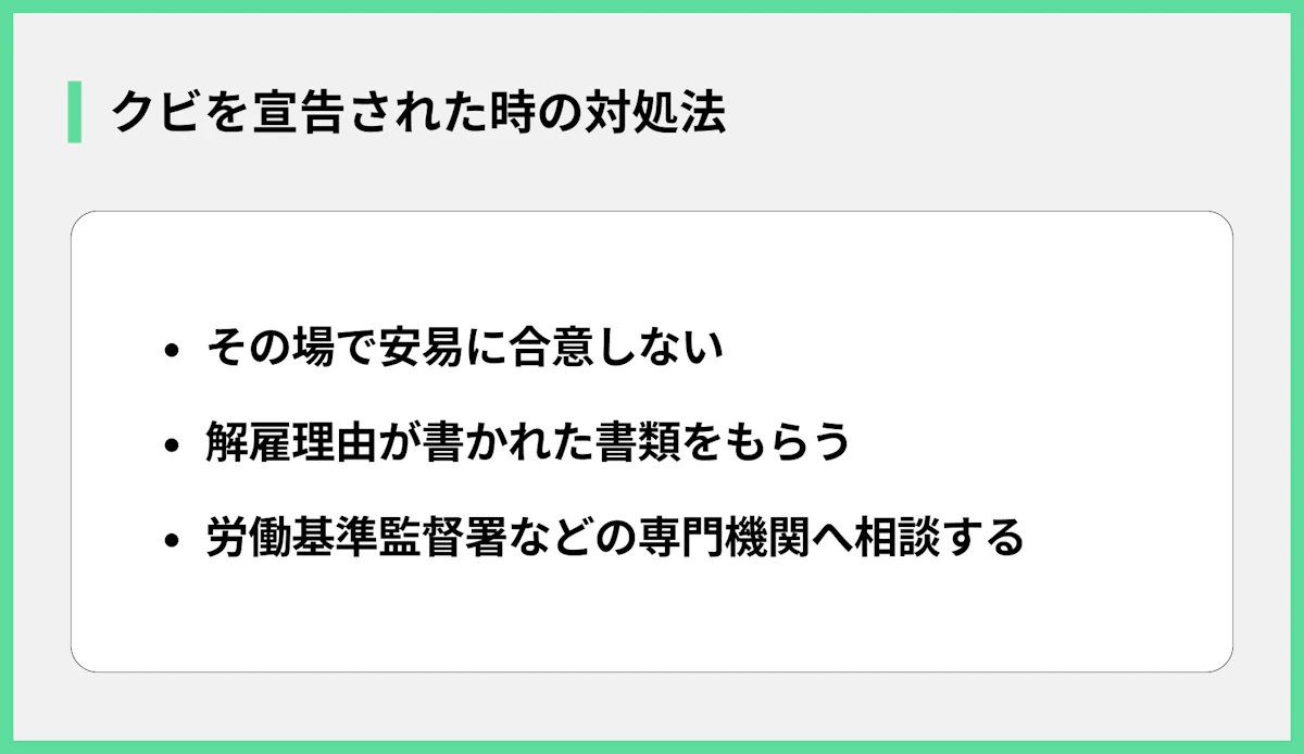 万が一、会社から「クビだ」と言われてしまったら、誰でも頭が真っ白になってしまうと思います。ですが、そんな時こそ冷静に行動することが、自分を守るために重要です。このセクションのポイントは以下の通りです。