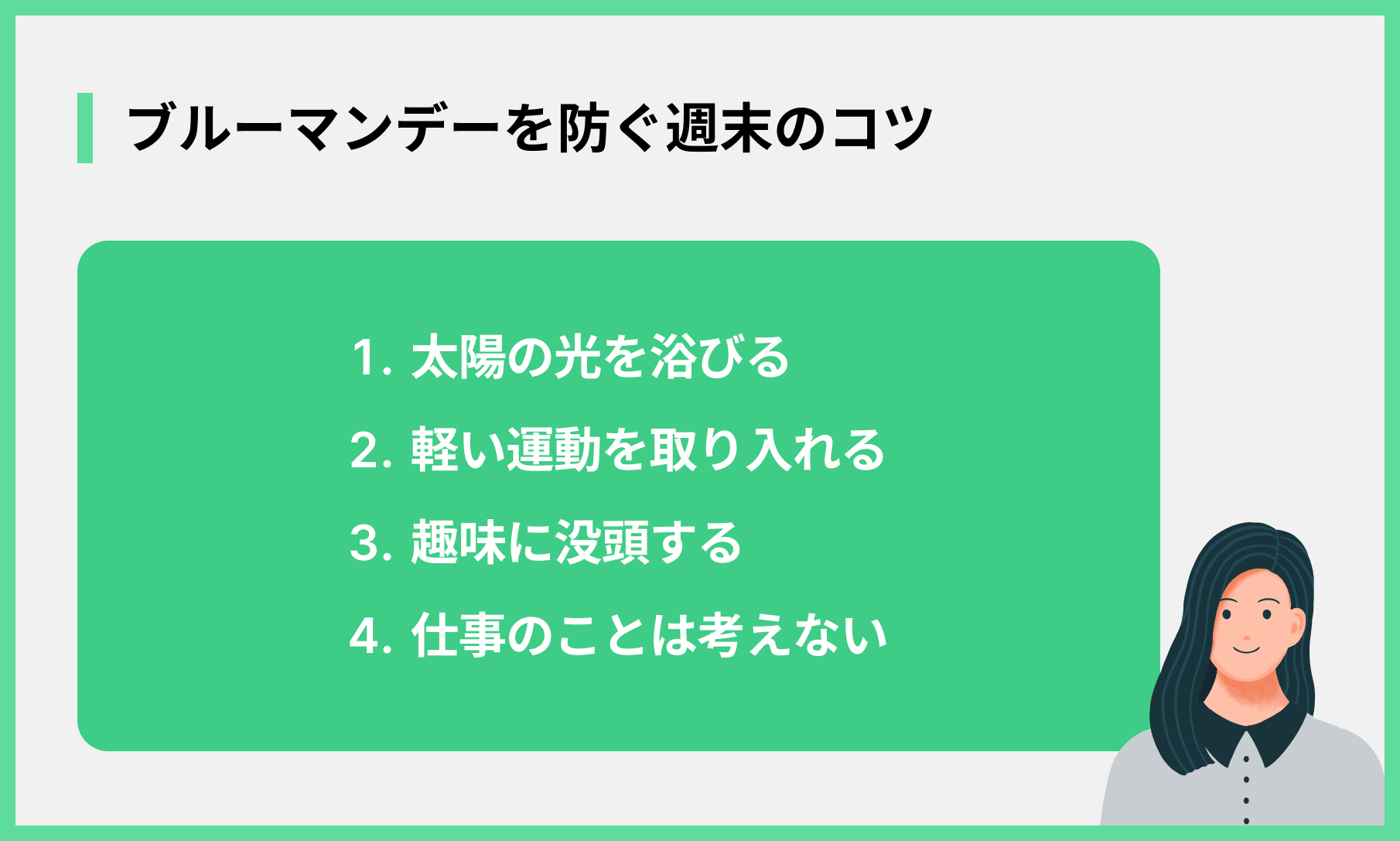 月曜日の不調は、実は週末の過ごし方に原因があることも少なくありません。ブルーマンデーを予防するための週末の過ごし方について、以下のポイントを紹介します。