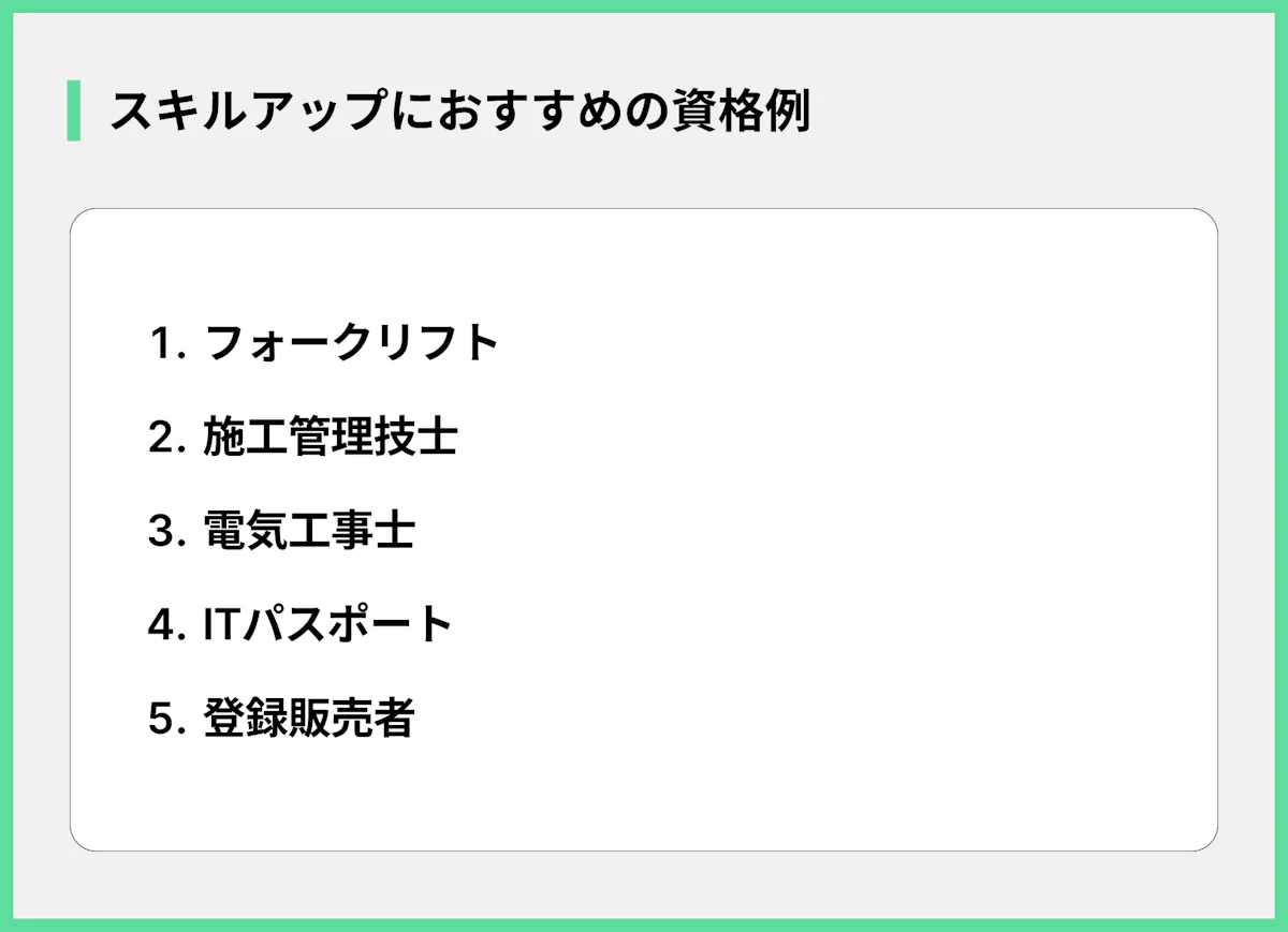 専門的な資格の取得は、自分のスキルを客観的に証明する強力な武器になります。例えば、建設現場なら施工管理技士、工場ならフォークリフトの免許や各種技能士、IT系なら基本情報技術者試験など、仕事に関連する資格はたくさんあります。資格があれば、昇進や転職の際にも有利に働く可能性が高まります。