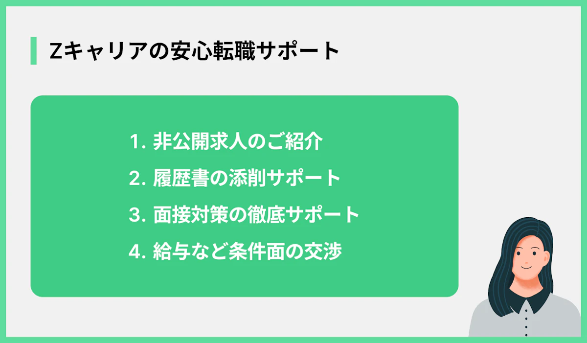 Zキャリアのエージェントに相談すれば、希望や経験に合った求人をピックアップして紹介してくれます。 膨大な求人情報の中から、自分で自分に合う会社を探し出すのは大変な作業です。 エージェントに任せることで、効率的に転職活動を進めることができます。非公開求人など、自分では見つけられない優良な会社に出会えるチャンスもあります。