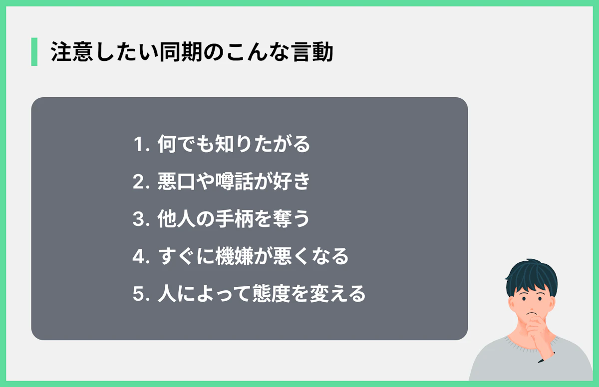「同期だから」と軽く考えてしまいがちですが、精神的な苦痛を与える行為はハラスメントです。 例えば、挨拶をしても無視されたり、わざと聞こえるように悪口を言われたり、仲間外れにされたり…。これらは、心を傷つける立派なハラスメント行為です。 「これくらいで騒ぐのは大人気ないかも」と思う必要はありません。自分が辛いと感じたら、それは解決すべき問題です。