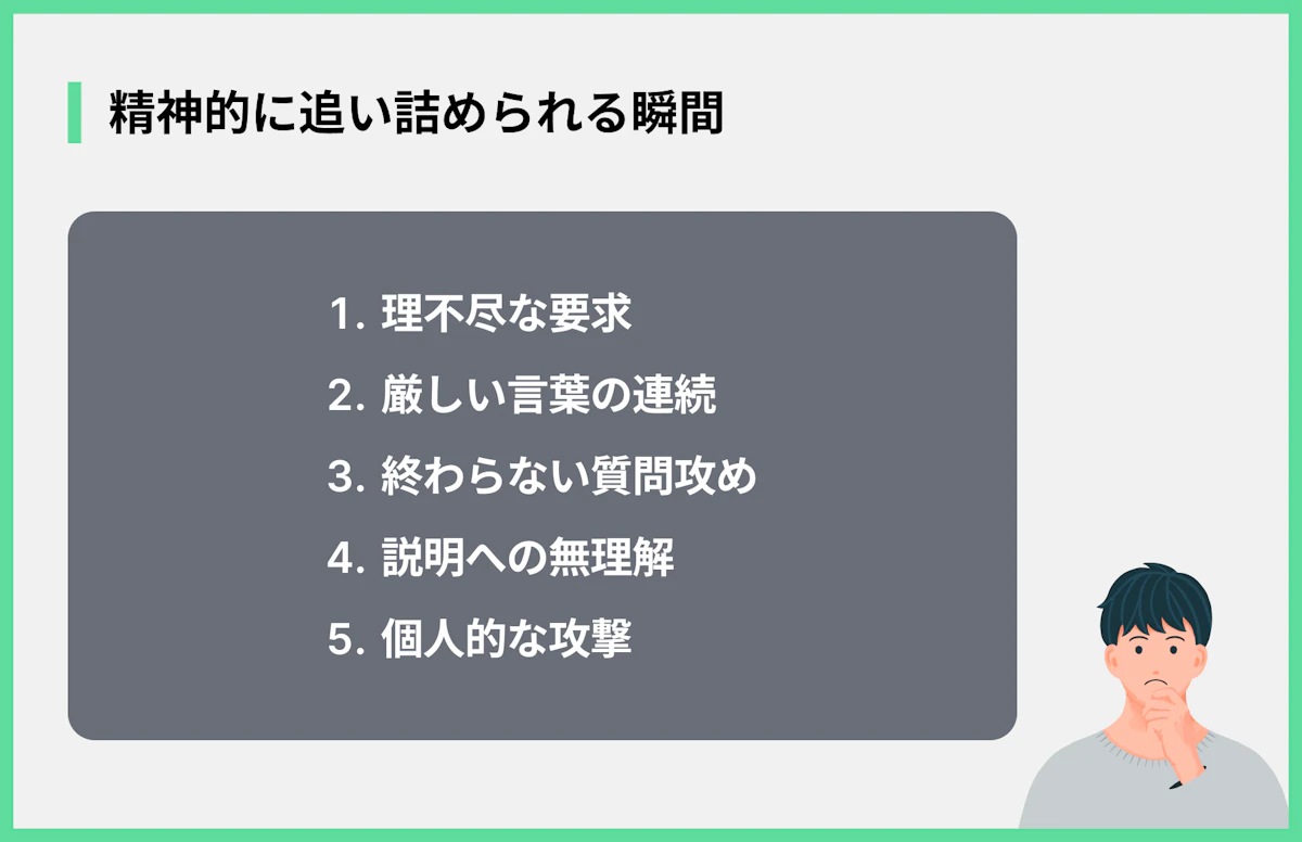 お客様の中には、マニュアルでは対応できないような要求をしてくる方もいます。「ルール上できません」と伝えても納得してもらえず、長時間にわたって交渉が続くこともあります。自分には何の非もないのに、会社の代表として謝り続けなければならない状況は、大きなストレスとなります。中には、個人的な不満をぶつけてくるような方もいるため、精神的な負担は決して軽くありません。このような理不尽な要求にうまく対処できず、ストレスを溜め込んでしまうことが、仕事を「きつい」と感じる大きな原因の一つです。
