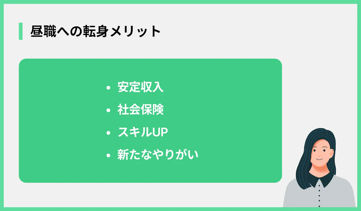 昼職に転職する大きなメリットの一つは、安定した収入と休日を手に入れられることです。多くの場合、会社員として働くことになるため、毎月決まったお給料がもらえます。これにより、生活の計画が立てやすくなり、将来への安心感も増します。また、土日祝日休みや有給休暇など、休日もしっかりとれる会社が多いので、プライベートの時間も充実させやすくなるでしょう。