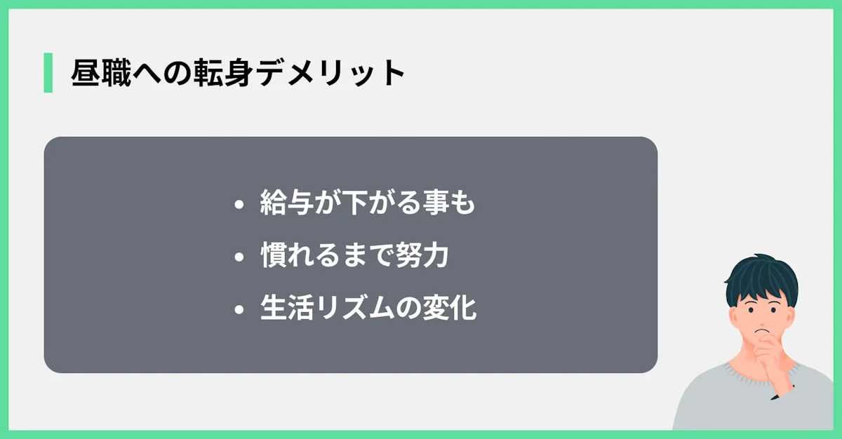 昼キャバから昼職への転職には多くのメリットがありますが、一方でデメリットや注意しておきたい点もいくつかあります。事前に理解しておくことで、転職後のギャップを減らすことができるでしょう。主なデメリットとして、以下の3つの点が考えられます。