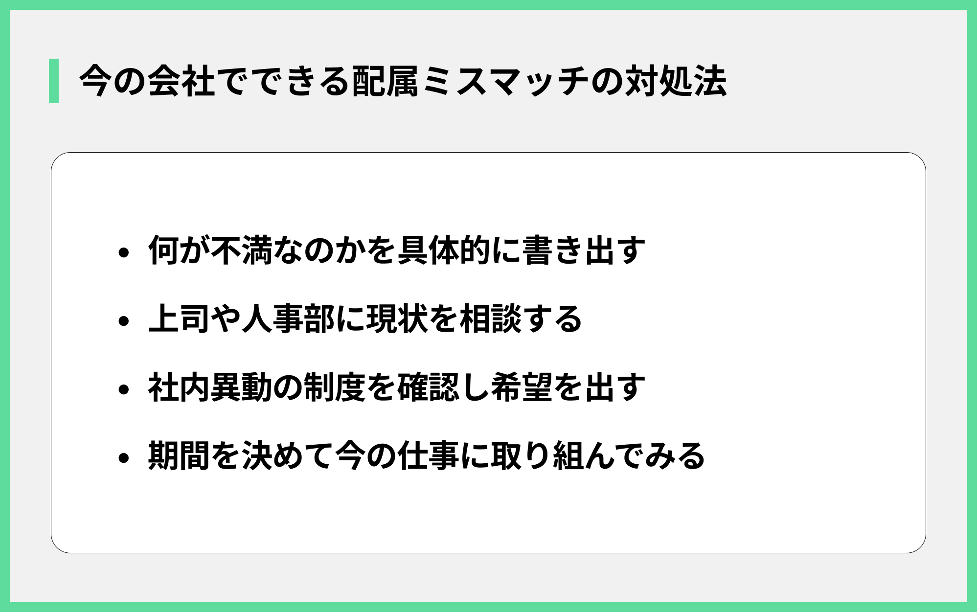 「配属先が合わないから、すぐに辞めよう」と決断する前に、今の会社でできることがないか試してみる価値はあります。具体的な対処法は以下の通りです。