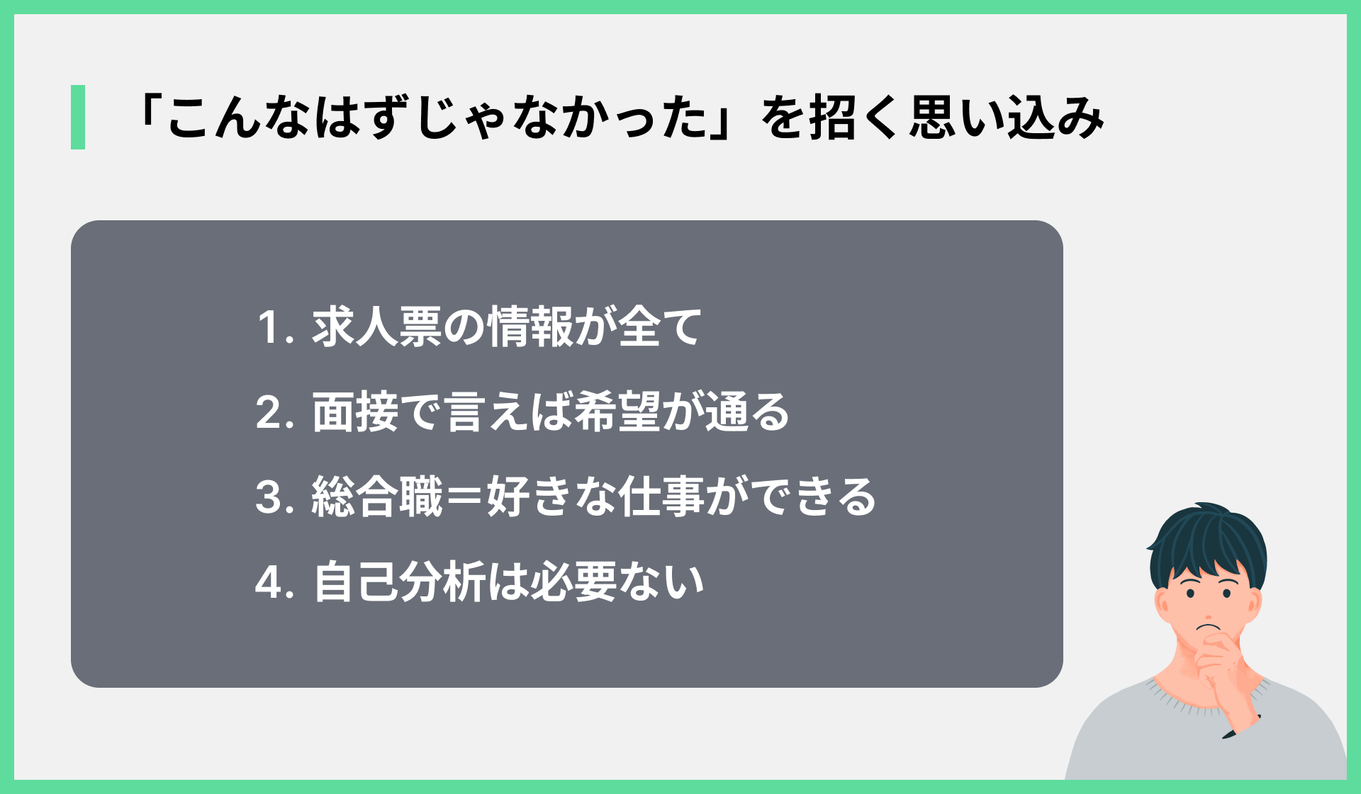 入社前に抱いていたイメージと、実際に配属された部署の仕事内容が違う「配属ミスマッチ」。なぜ、このようなことが起きてしまうのでしょうか。主な原因は以下の通りです。
