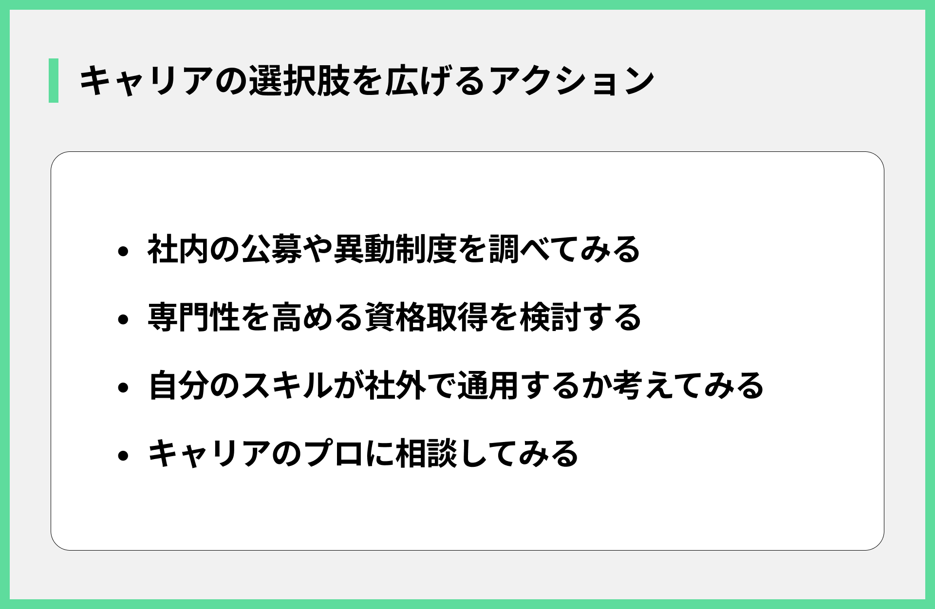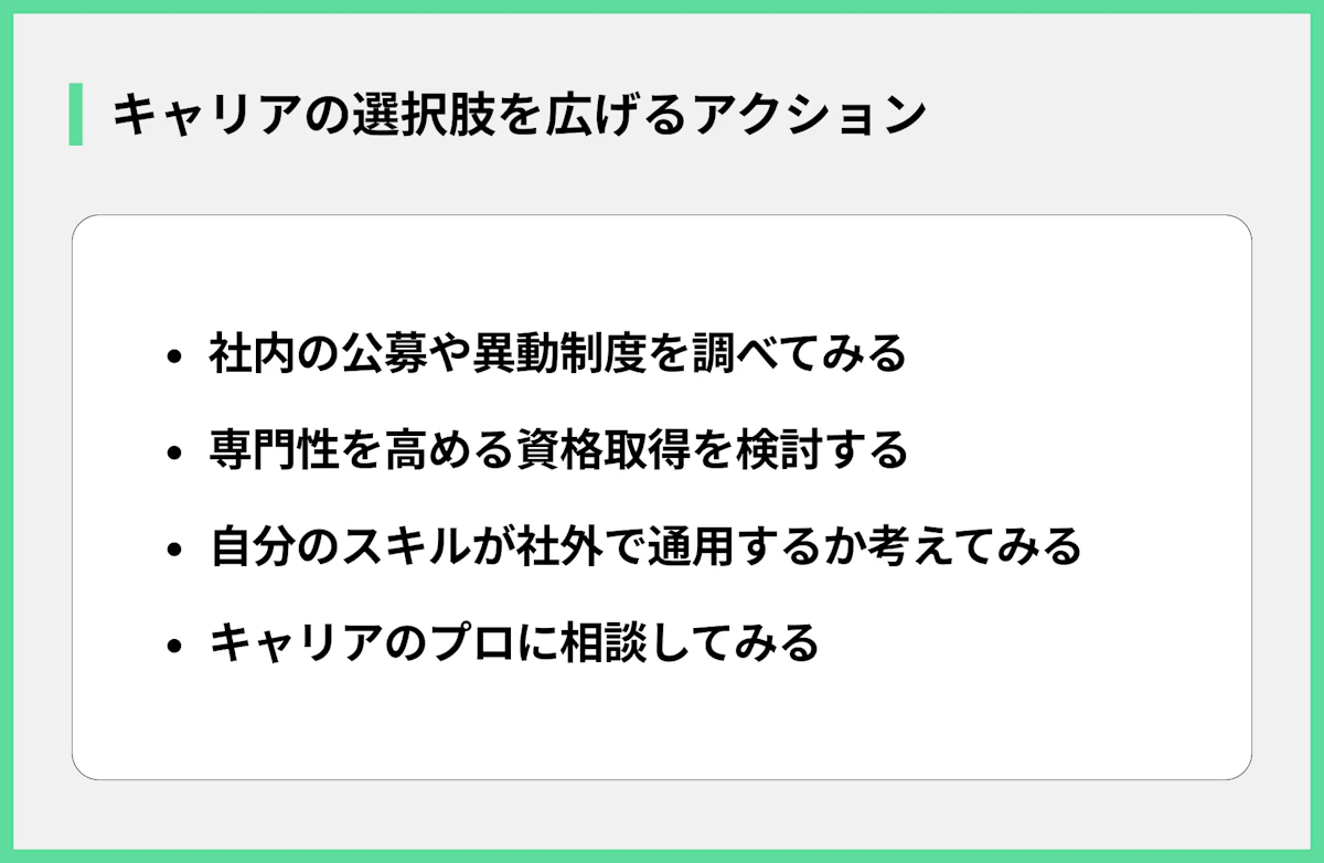様々な努力をしても、どうしても今の環境ではキャリアアップが望めない、と感じることもあるかもしれません。そんな時は、少し視点を変えてみましょう。ここでは、考えられる選択肢について以下の項目で解説します。