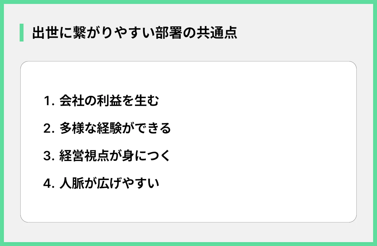 「出世コース」という言葉を耳にすることがありますが、具体的にどのような部署を指すのでしょうか。ここでは、その特徴について以下の項目で解説します。