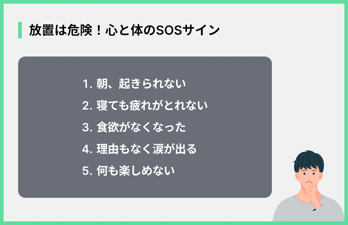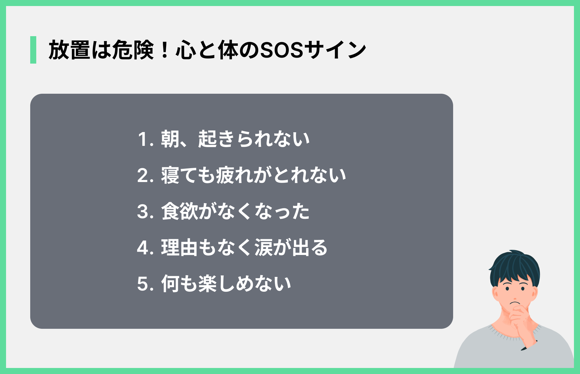 「出社したくない」という気持ちは、心や体が発している危険信号かもしれません。十分な睡眠をとっても疲れが取れない、朝になると気分が落ち込んで起き上がれない、食欲がない、仕事中も集中力が続かないといった症状は、過度なストレスによる心身の不調のサインです。こうしたサインを「気合が足りないだけ」と見過ごしてしまうのは非常に危険です。無理を続けてしまうと、うつ病などの精神的な病気につながる可能性もあります。自分の体と心の声に耳を傾け、少しでも異変を感じたら、それは「休むべき時」だという大切なメッセージだと捉えることが重要です。