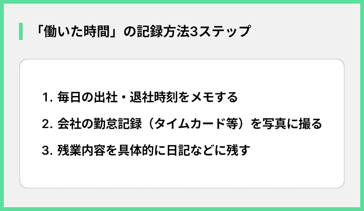 万が一、残業代の未払いや会社とのトラブルに発展した場合に備えて、実際に働いた時間を証明できる証拠を残しておくことが非常に重要です。客観的な記録が、自分を守るための武器になります。会社にタイムカードや勤怠管理システムがある場合は、毎日正確に打刻することを徹底しましょう。もし手書きの出勤簿など、後から修正できてしまうようなものしかない場合は、自分でも記録をつけておくと安心です。例えば、スマートフォンのメモ帳やスケジュールアプリに、毎日の始業時間と終業時間を記録しておくだけでも有効です。会社のパソコンを使っているなら、業務日報や、業務終了時に上司に送るメールの送信時刻なども客観的な証拠になりえます。