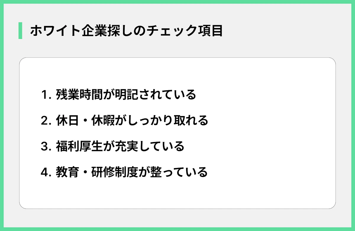 一度、働き方で悩んだからこそ、次の職場選びは慎重に行いたいものです。残業が少ない、自分に合った会社を見つけるためのポイントは以下の通りです。