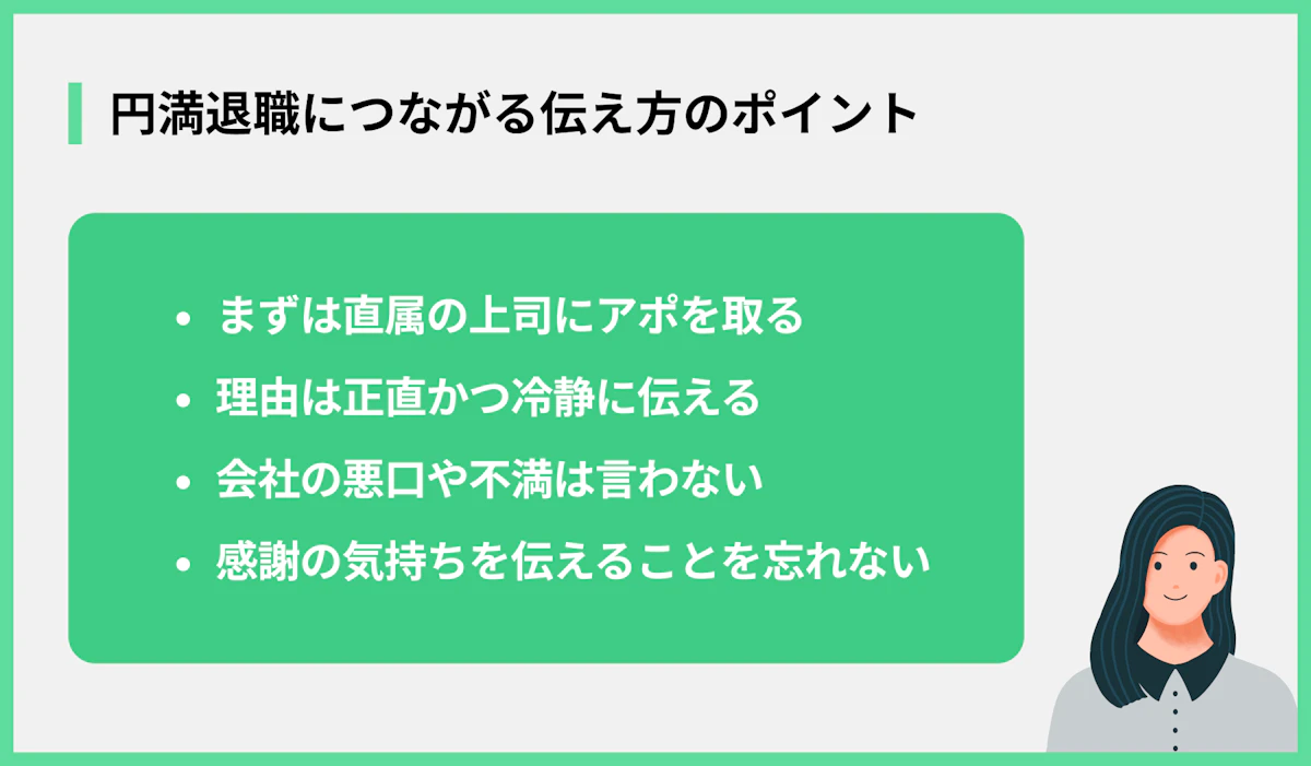 辞める決意が固まったら、まずは直属の上司に直接、退職の意思を伝えます。電話やメールではなく、アポイントを取って対面で話すのが基本です。その際は、「お話がありますので、少しお時間をいただけないでしょうか」と切り出しましょう。退職理由を聞かれた際は、正直に「残業時間が想定していたよりも多く、体力的に続けていくことが難しいと感じました」と伝えて問題ありません。会社の不満を感情的にぶつけるのではなく、あくまで「自分の力不足」や「適性の問題」として伝えると、相手も受け入れやすくなります。退職希望日は、業務の引き継ぎなどを考慮して、申し出た日から1ヶ月後くらいを目安に相談するのが一般的です。上司と相談の上、最終的な退職日を決定します。