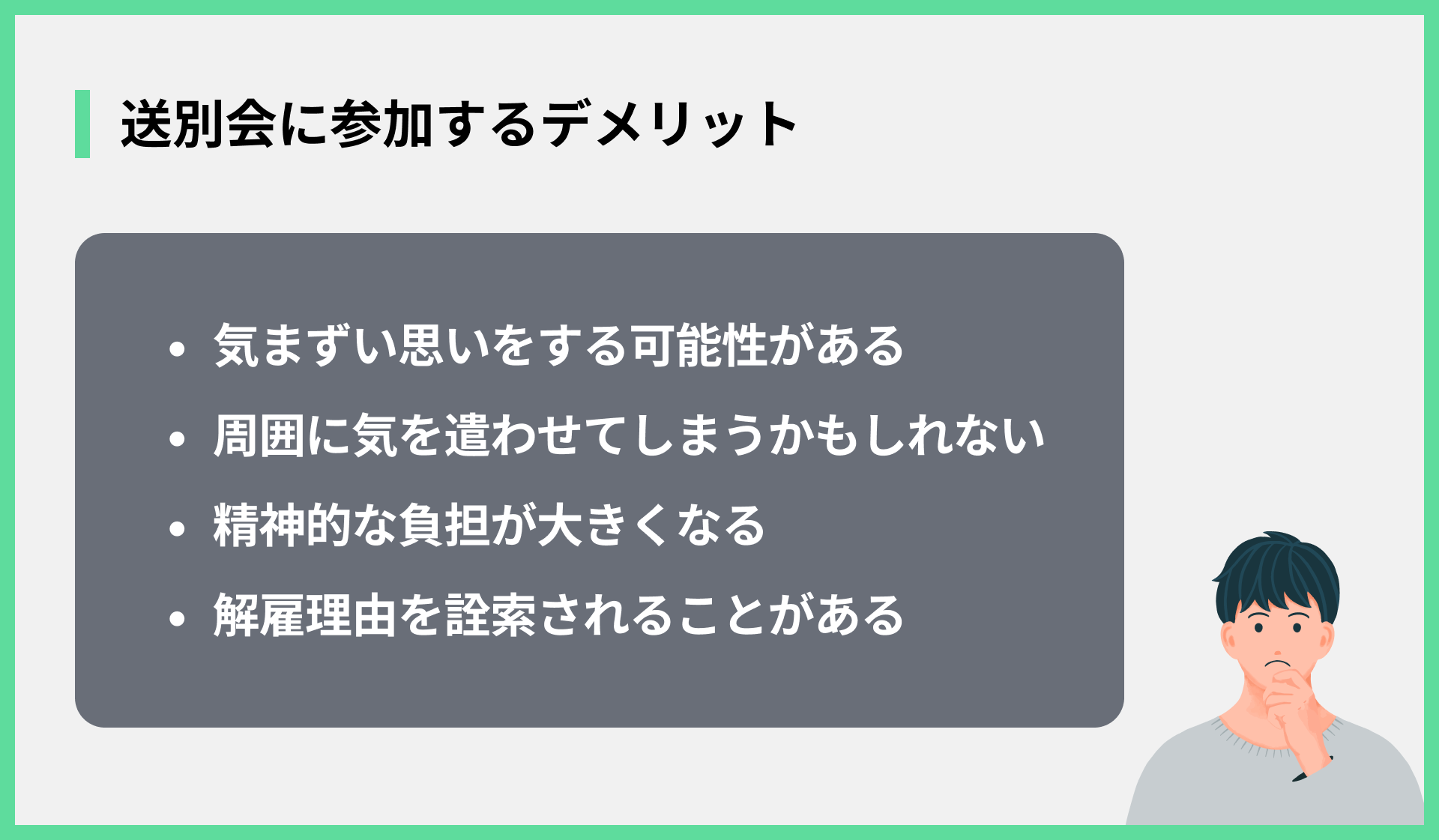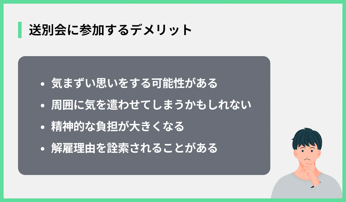 一方で、解雇された状況で送別会に参加することには、当然デメリットも存在します。考えられるマイナス面は以下の通りです。