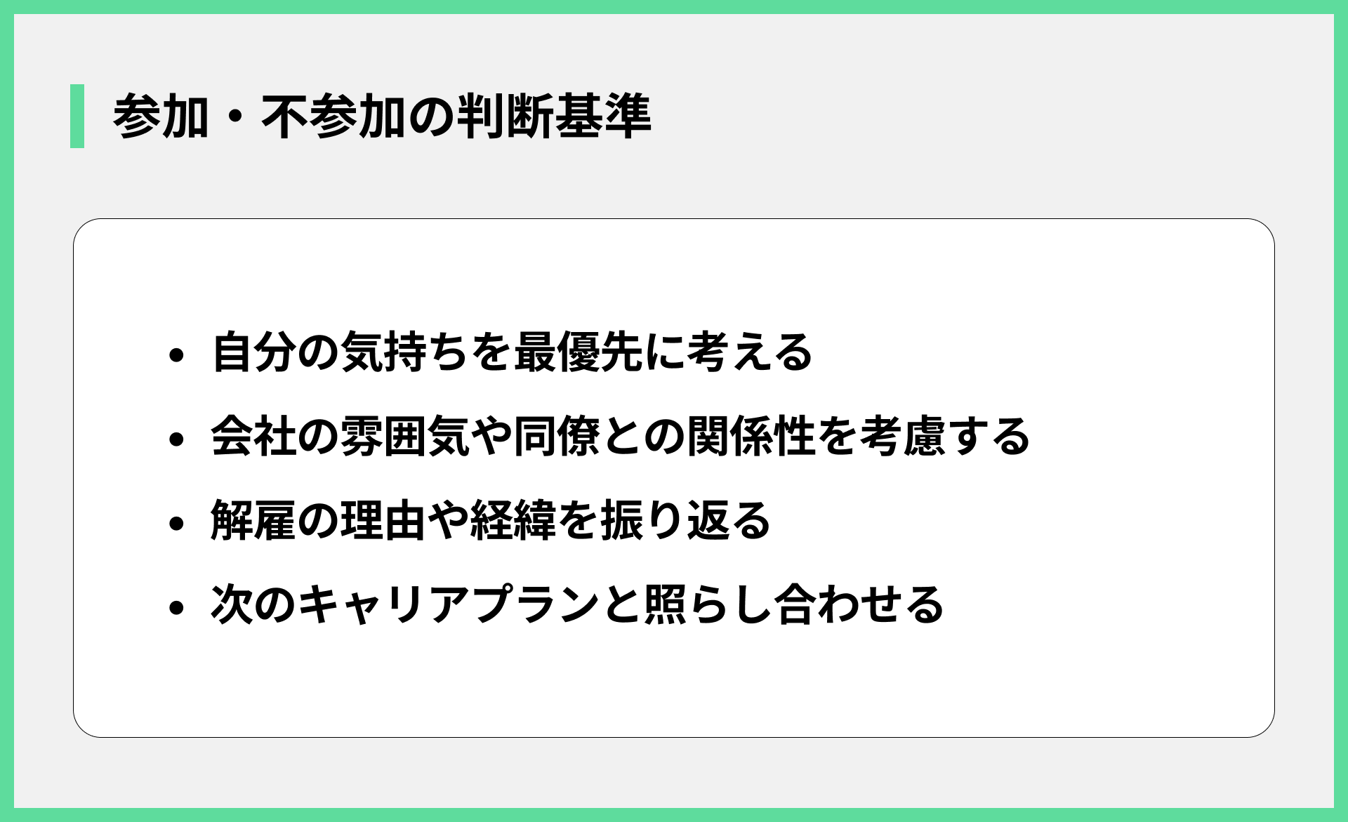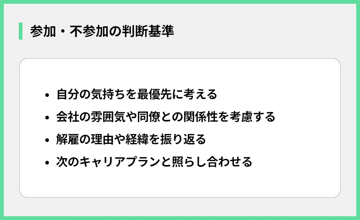 解雇という状況での送別会、参加すべきか悩みますよね。まずは、参加を判断するための基本的な考え方について、以下の項目で解説します。