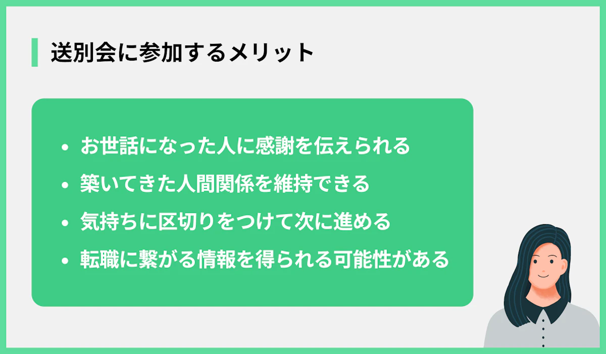 辛い気持ちの中で参加するのは勇気がいることですが、送別会に出ることで得られるプラスの面もあります。参加する場合のメリットは、以下の通りです。