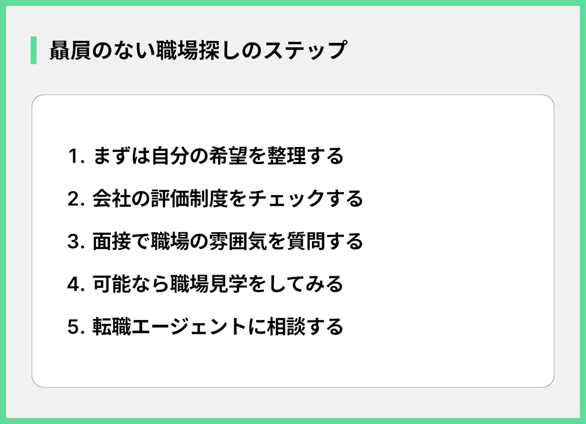 では、どうすれば贔屓のない、自分らしく働ける職場を見つけることができるのでしょうか。そのためのポイントは、以下の通りです。