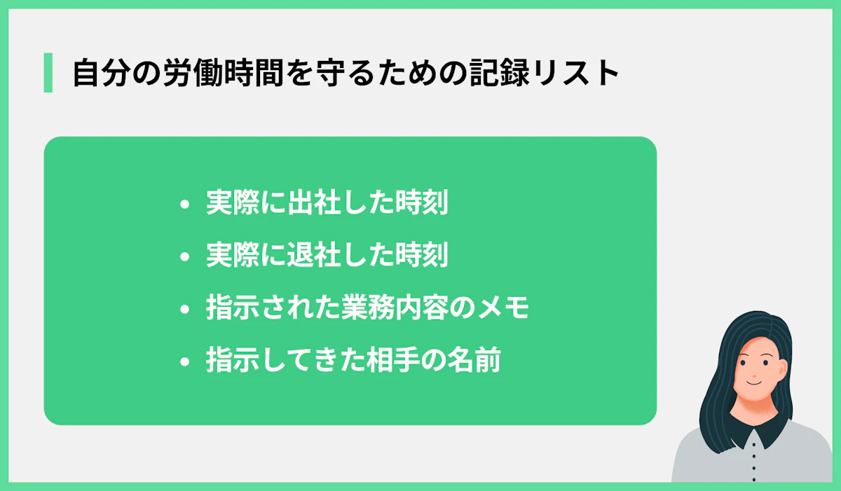 もし上司に相談しても状況が変わらない場合に備えて、実際に働いた時間を記録しておきましょう。タイムカードのコピーを取ったり、スマホのメモ帳に「〇月〇日、〇時〇分に出社、〇時〇分に退社」と毎日メモしたりするだけでも、後で自分の労働時間を証明する大切な証拠になります。面倒に感じるかもしれませんが、自分の身を守るために重要な行動です。