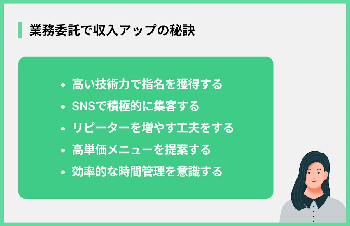 「業務委託美容師は稼げない」なんて言わせない!収入をアップさせるためには、いくつかの秘訣があります。具体的には以下のポイントを意識してみましょう。 詳しく見ていきましょう。