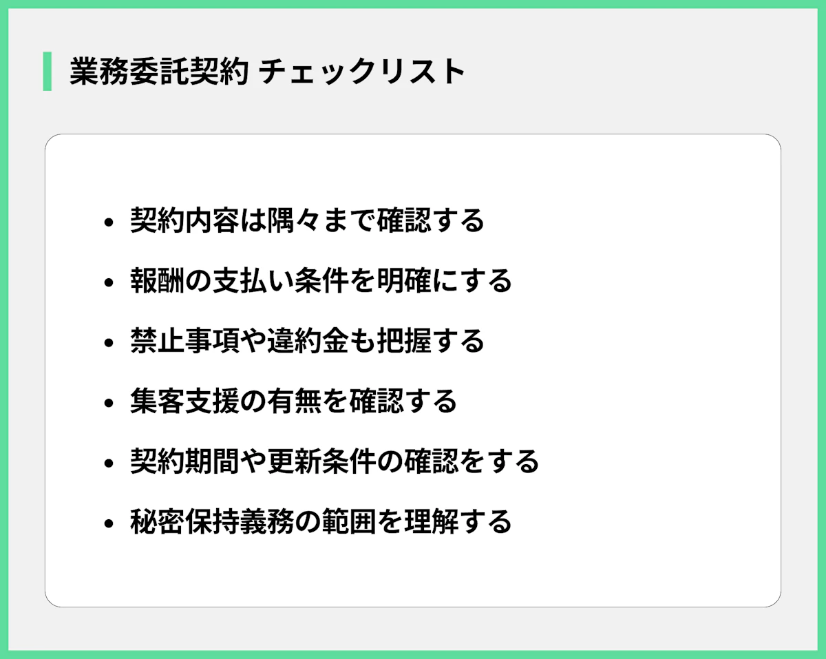 業務委託美容師として働くことを決めたら、サロンとの契約内容をしっかり確認することが非常に重要です。後で「こんなはずじゃなかった」と後悔しないために、以下のポイントに注意しましょう。