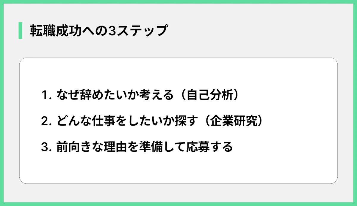 では、どうすれば早期離職からの転職を成功させられるのでしょうか。ポイントは以下の3つです。
