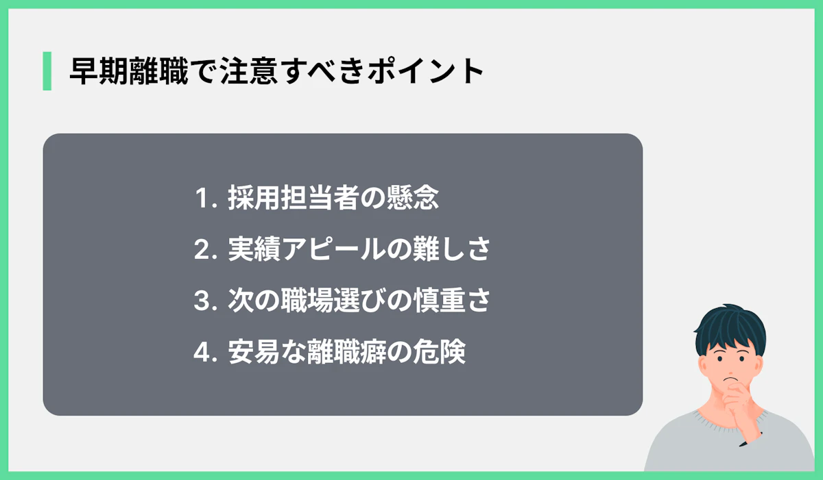 メリットがある一方、早期離職には注意すべきデメリットもあります。以下の3つの点について解説します。