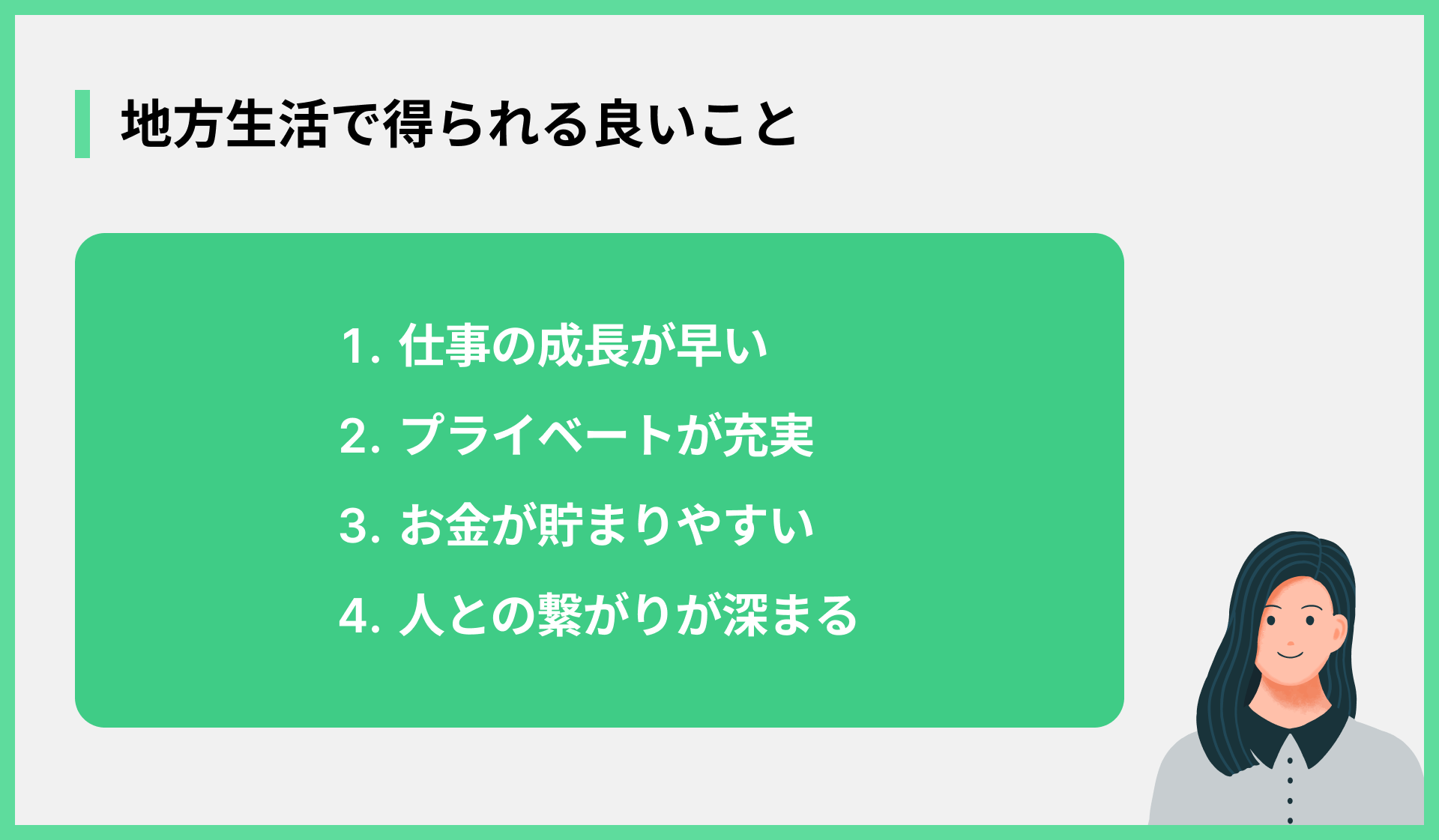 地方配属と聞くと、デメリットばかりが思い浮かぶかもしれませんが、実は都市部での勤務では得られないような多くのメリットも存在します。具体的には、以下の通りです。