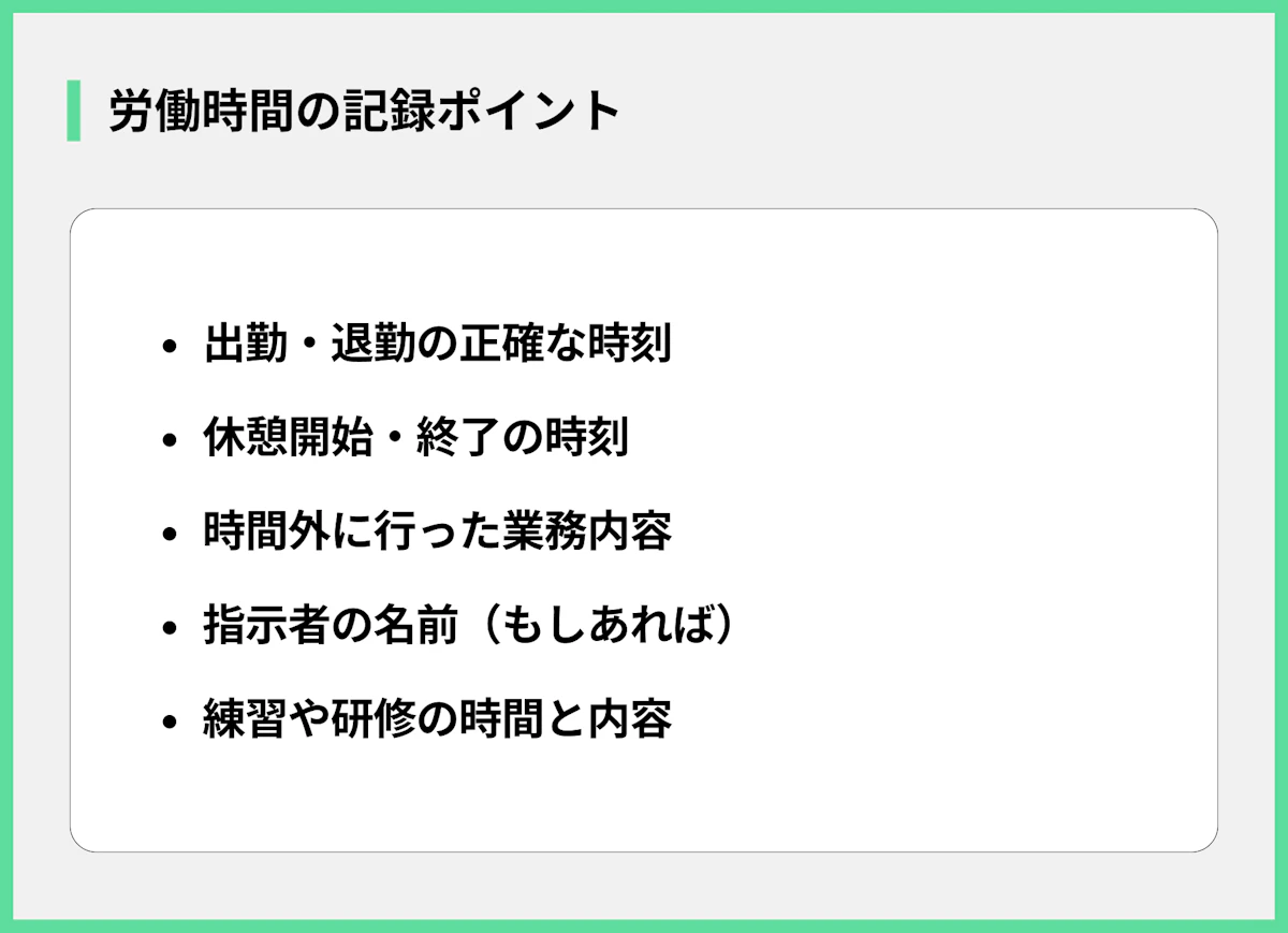 まず大切なのは、自分の労働時間を客観的に記録することです。いつからいつまで働いたのか、休憩はきちんと取れたのか、どのような業務を行ったのかを毎日記録しておきましょう。手書きのメモでも、スマートフォンのアプリでも構いません。タイムカードの打刻時間だけでなく、実際に作業を開始した時間や終えた時間を記録することがポイントです。