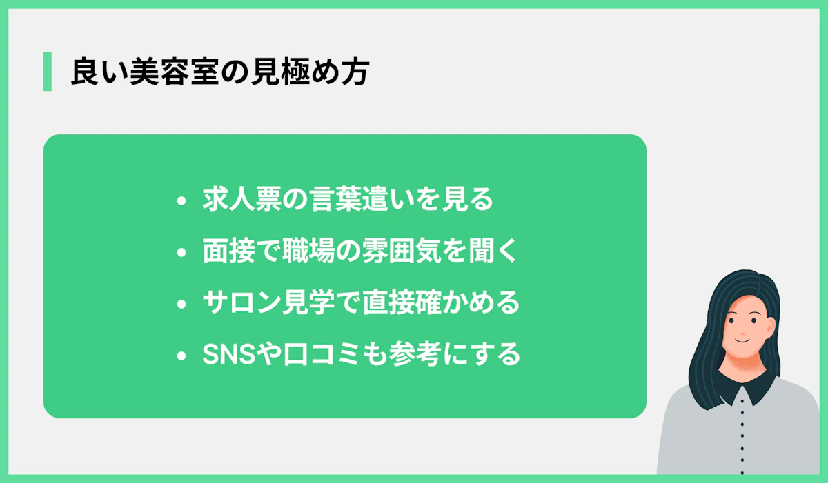 可能であれば、実際にサロン見学をさせてもらうのが一番確実な方法です。営業中のサロンの雰囲気や、スタッフ同士の会話、お客様への対応などを自分の目で直接確かめることができます。
