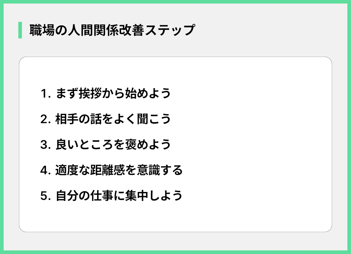 今の職場で人間関係を少しでも良くするために試せる具体的な行動や考え方について、ポイントは以下の通りです。