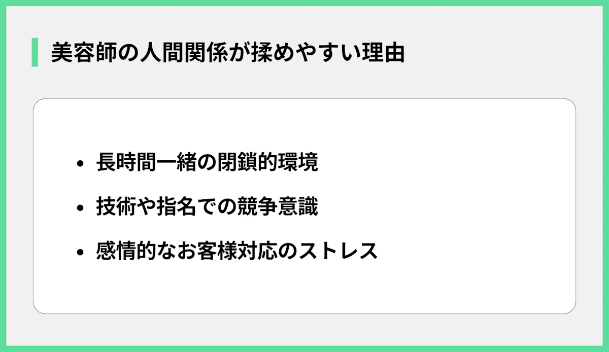 同僚は本来、支え合える仲間ですが、美容室特有の環境からライバル関係になりやすく、ギスギスした雰囲気になることもあります。