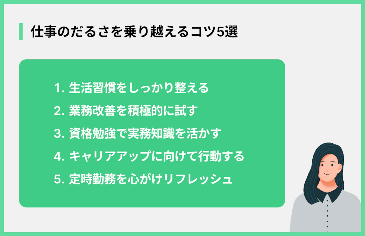 毎日の仕事が単調でだるさを感じるなら、自分から業務改善を試みてみましょう。非効率だと感じる作業手順を見直す、新しいツールを導入して作業時間を短縮する、あるいは上司に業務の進め方について提案してみるのも良いでしょう。小さなことでも、自分で工夫して改善できたという実感は、達成感や仕事への主体性を高めます。また、改善活動を通じて、これまで見えていなかった仕事の面白さや、自分の新たな能力に気づくこともあります。受け身で仕事をこなすのではなく、能動的に関わっていくことで、だるさを軽減できる可能性があります。