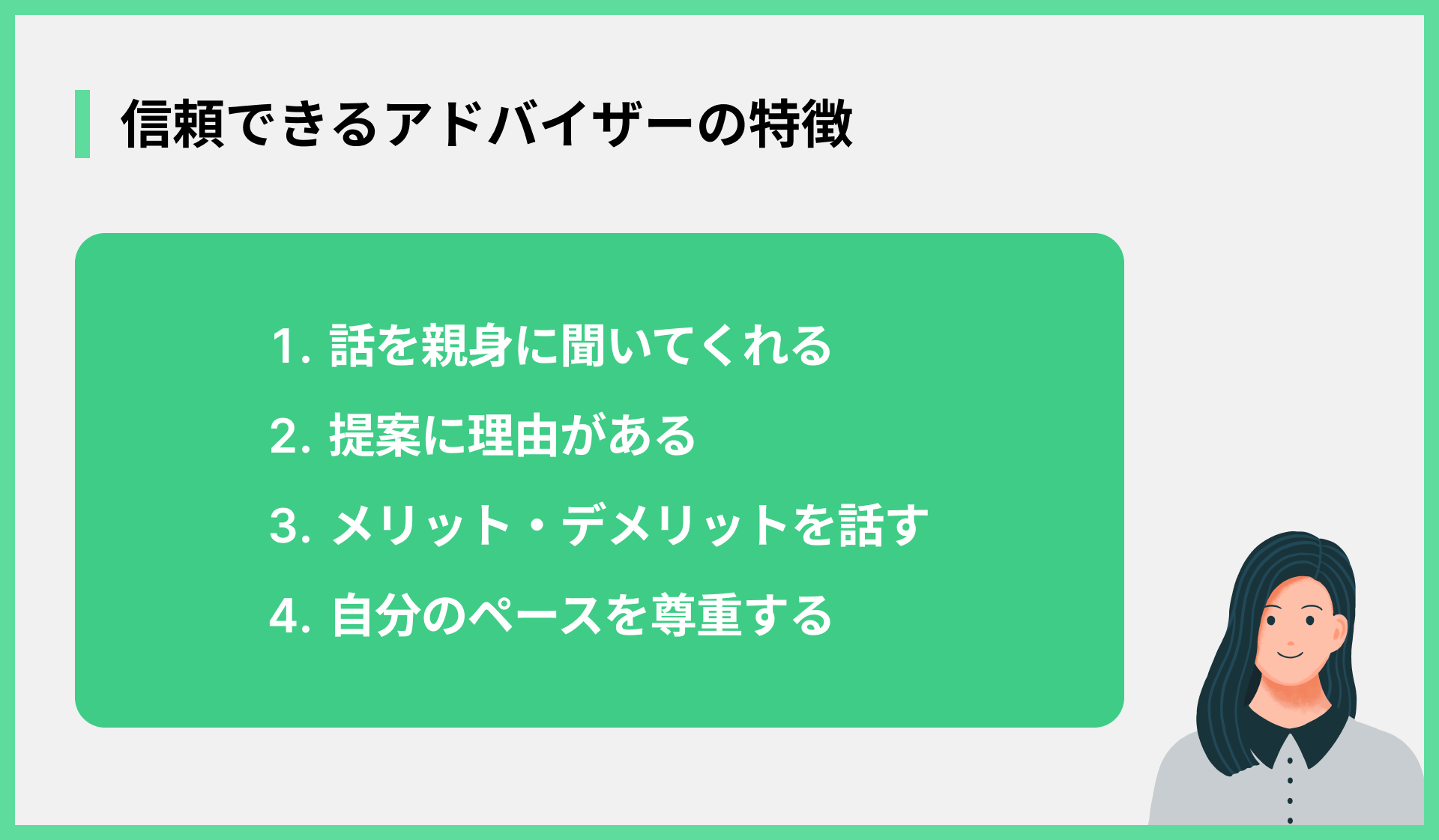 一番分かりやすいのは、こちらの希望を全く聞いてくれないケースです。何度も伝えているにもかかわらず、勤務地や職種、給与などの希望条件から大きく外れた求人ばかりを紹介してくる場合、そのアドバイザーはあまり信頼できません。自分の営業成績のために、とにかくどこかに入社させようとしている可能性があります。もちろん、時には視野を広げるために、あえて希望とは少し違う求人を提案してくれる場合もあります。ですが、その際にきちんとした提案理由の説明がなく、ただ的外れな求人を送りつけてくるだけのアドバイザーであれば、見切りをつけた方が良いかもしれません。転職は自分の将来を決める大切な活動です。希望に寄り添ってくれない担当者と無理に付き合う必要はありません。