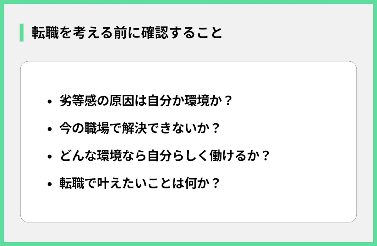 劣等感の原因が自分自身の考え方や捉え方にある場合、転職しても問題が解決しない可能性があります。