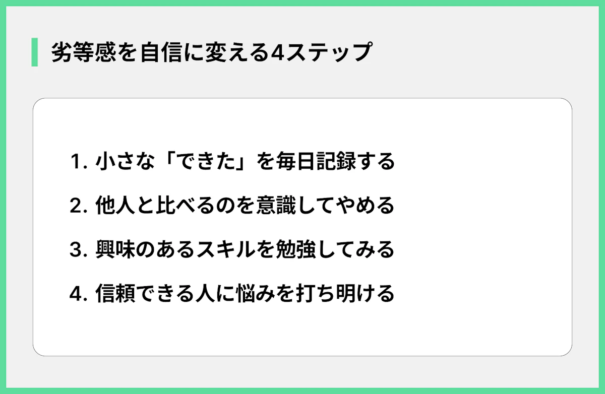 では、辛い劣等感を乗り越えるためには、具体的にどうすれば良いのでしょうか。誰でも今日から始められる具体的な方法は以下の通りです。