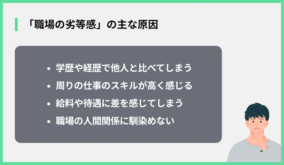 職場で劣等感を感じてしまうのには、いくつかの原因が考えられます。具体的な原因については、以下の通りです。