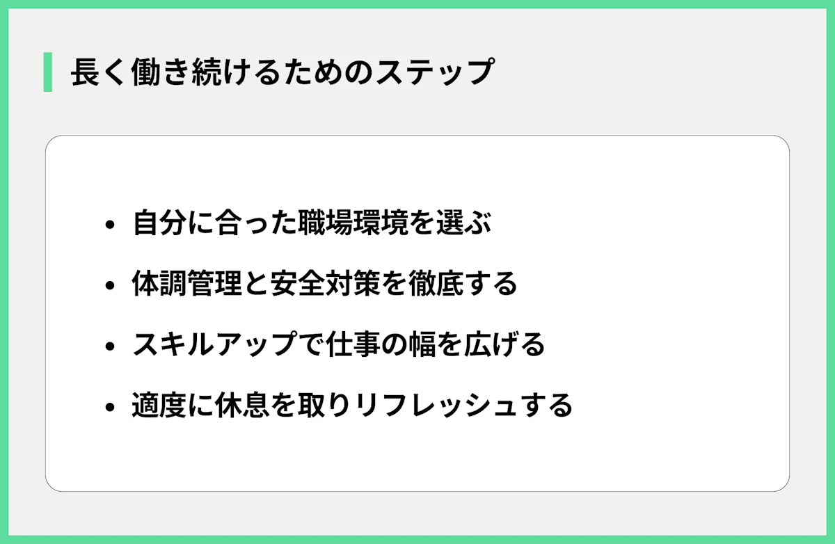 「きつい」と言われることもある溶接工の仕事ですが、工夫次第でやりがいを持って長く続けることは可能です。ここでは、そのための具体的なポイントを解説します。主なポイントは以下の通りです。