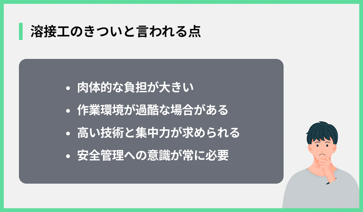 メリットがたくさんある一方で、溶接工として働く上でのデメリットや注意点も理解しておくことが大切です。ここでは、考えられるデメリットについて解説します。具体的には以下の通りです。