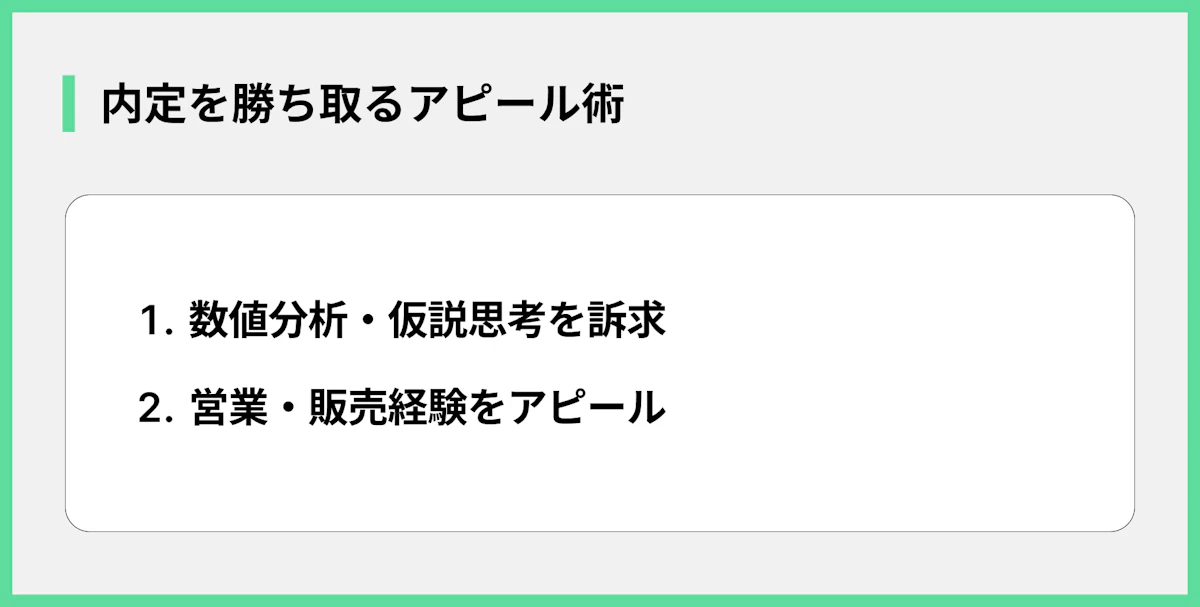 マーケに求められる数値分析や仮説思考について今までの仕事の経験をもとにアピールする