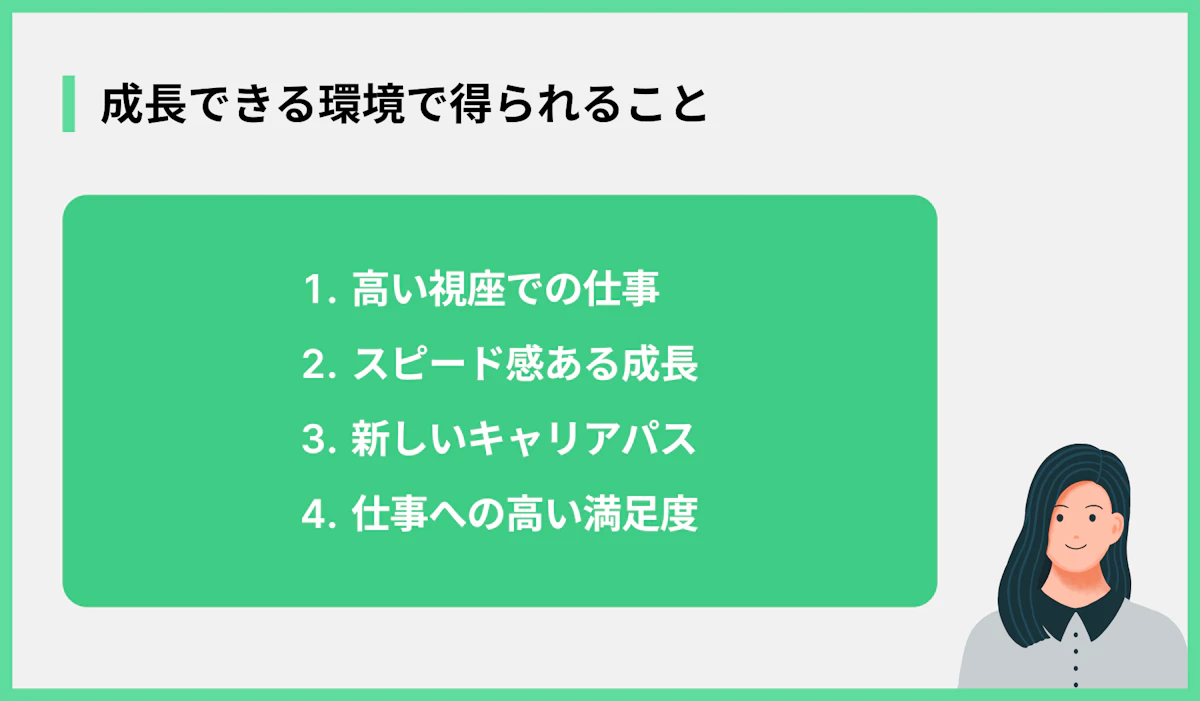 今の職場で対処法を試しても状況が改善しない、あるいは「もっと高いレベルの環境で挑戦したい」という気持ちが強いなら、転職は有効な選択肢です。環境を変えることのメリットは、以下の通りです。