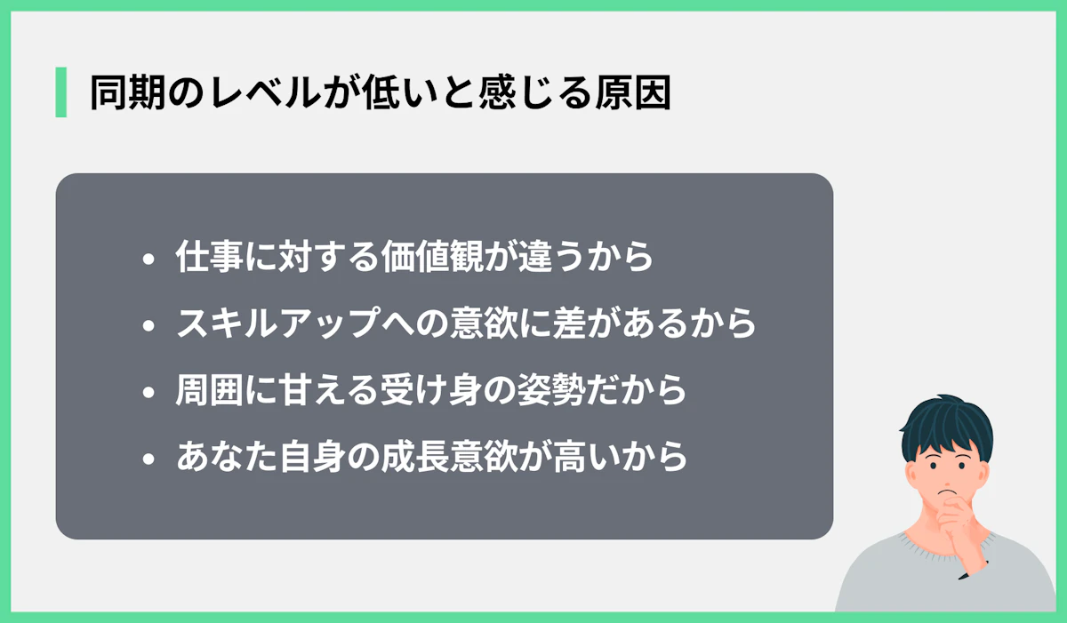 「自分だけ頑張っている気がする」「周りの意識が低くてやる気が出ない」と感じることはありませんか。同期のレベルが低いと感じる背景には、いくつかの理由が考えられます。考えられる理由は、以下の通りです。