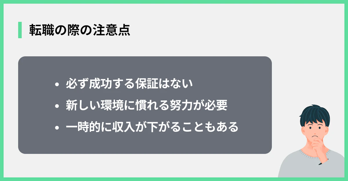 転職は収入アップの大きなチャンスですが、良いことばかりではありません。新しい環境に飛び込むことには、いくつかの注意点や覚悟しておくべきこともあります。